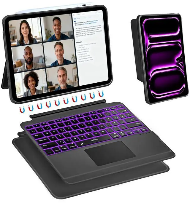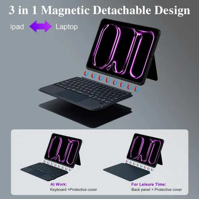 Design: Detachable magnetic keyboard for ipad case stand, strong magnets secure stable attachment. Instantly transforms iPad case into a typing keyboard or adjustable viewing stand. Suitable for movies, video calls and meetings. Ideal for office travel and outdoor adventures. PU Leather full-edge coverage, protects iPad from drops and scratches ^^ Slim Design &
