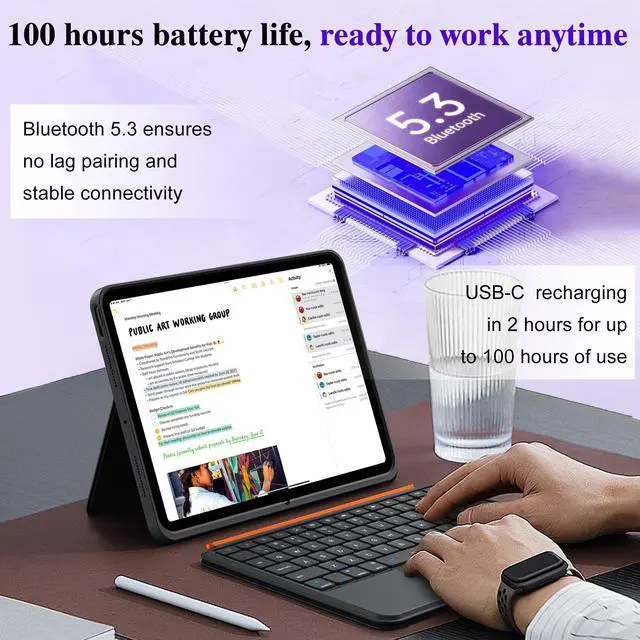 Bluetooth No Lag: iPad keyboard 0.25 inch ultra-thin design. The foldable stand adjusts from 0to 170, fill needs for different angles. Bluetooth 5.3 ensures instant, no lag pairing and stable connectivity. Easily switch to work mode during commutes or in cafes ^^ Silent Backlit Keys & Long