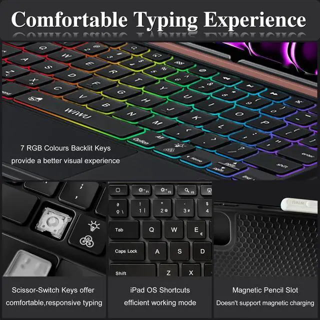 Battery Life: Scissor-switch keys offer comfortable, responsive typing with quiet 1mm travel, suitable for libraries and offices. USB-C recharging in 2 hours for up to 100 hours of use. 7 RGB colours backlit keys for comfort and productivity in any dimly lit area ^^ Precise Touchpad & iPadOS