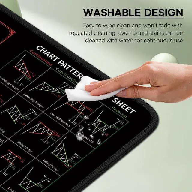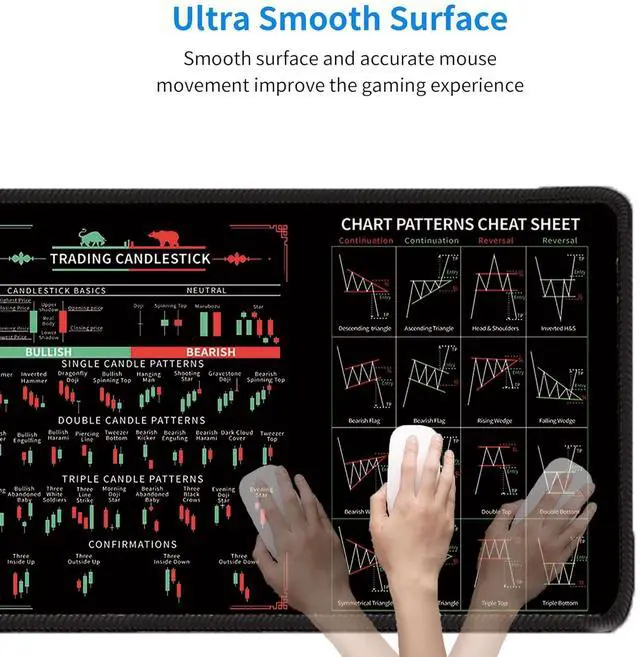 ALL-IN-ONE TRADING COMPANION Keep essential knowledge at your fingertips. The printed cheat sheet features clear, easy-to-read diagrams of the most critical candlestick and chart patterns (like Head & Shoulders, Double Tops/Bottoms, Bullish/Bearish Flags, and more), saving you precious time from searching through screens or books mid-trade. ^^ PREMIUM QUALITY & DURABILITY Built to withstand the rigors of a fast-paced trading environment. The smooth, high-density micro-woven fabric surface ensures precise and fluid mouse tracking, while the robust rubber base guarantees it stays firmly in place through every market move. ^^ ENHANCE WORKFLOW & EFFICIENCY Its expansive desktop-scale dimensions ( 31.5" x 11.8" )