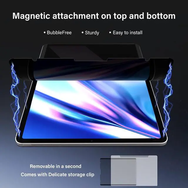 Fit Models: A2324/A2072/A2316/A2325/A2377/A2459/A2301/A2460. Please check the model number on the back bottom of your iPad ^^ EASY TO INSTALLStrong magnetic attachment on top and bottom make our privacy screen protector iPad air 11 inch more stable than others, install and remove in a second without residue and air bubbles. What's even sweeter is that it comes with a delicate storage clip, which can keep the anti-spy screen shield well when you take it off ^^ EXCELLENT PROTECTIONThis privacy iPad air 10.9 inch screen protector designed with the most advanced anti-glare technology from Germany AG to ensure our privacy screen protector blocks 95% of blue light and 92% UV light, protecting you and your screen out of damage ^^ HIGH QUALITYThis privacy iPad air 10.9 inch screen protector is made of premium PET material imported from Japan, Ultra-thin, washable, water & oil-proof, 9H hardness protect the screen from scratches and dust