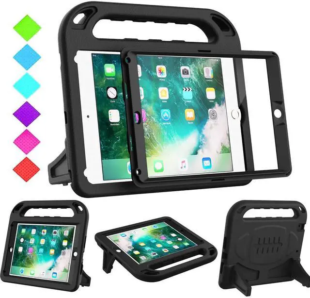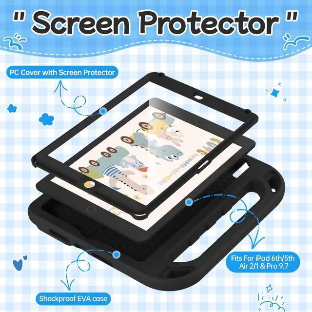 Fit Model - Designed for the iPad 9.7 inch 2018 (iPad 6th Generation) / iPad 9.7 inch 2017 (iPad 5th Generation) / iPad Air 1 / iPad Air 2 ^^ Built-in Screen Protector - Crystal-clear, fully integrated screen protector fits over top 9.7 inch iPad display ^^ Shockproof - Durable, heavy duty EVA foam is shock-resistant prevents bumps, and scratches from damaging for iPad 9.7 2018/2017 ^^ Full Access - Cutouts for clear access to all buttons, ports, speakers and rear-camera ^^ Built-in Kickstand - built in kickstand, makes your iPad with multi-angle watching!