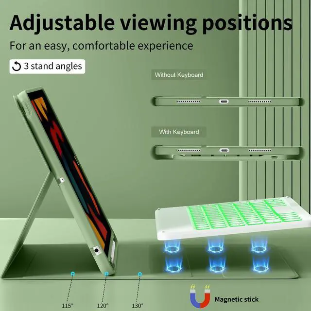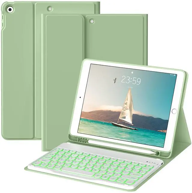 Note: Kindly verify your iPad's model before making a purchase by locating the model number (AXXXX) on the back of your iPad ^^ 7 Colors Backlit KeyboardThe iPad 9th/8th/7th Generation Keyboard Case features laser-etched illuminated keys and offers 7 LED backlighting colors and 3 brightness options for a comfortable typing experience even at night. You can choose your favorite color to enhance the visual enjoyment and make typing a relaxing and enjoyable experience ^^ Rechargeable & Long Life BatteryOur keyboard case for the 9th/8th/7th Gen iPad, featuring a built-in high-capacity battery, offers enhanced energy efficiency and reduced power consumption. It comes with a Type-C charging cable that can be fully charged in 2 hours without the need to replace the battery, ensuring that you can continue to work for up to 230 hours ^^ Magnetic Detachable Backlit KeyboardThis iPad 10.2 -inch case with keyboard features a magnetic design that holds the keyboard securely in place. With an easy, fast and stable connection to IOS, Windows and Android via Bluetooth, it's perfect for working, typing, editing or watching videos, dramatically increasing the productivity of your iPad ^^ Buit-in Pencil Holder & Sturdy TPU MaterialThe keyboard case compatible with the 9th, 8th, and 7th generation iPads boasts a handy pencil holder on its left side, allowing for effortless storage and retrieval of your pencil (Pencil not included).
