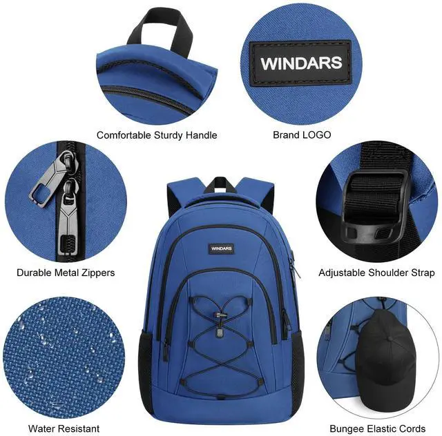 DescriptionOften imitated but never equaled. Windars will not let you down on your daily commute to school, to work or on your favorite trail. The Windars Backpack is made from a durable polyester fabric and features ample carrying capacity inside & out thanks to a large capacity main compartment with a laptop pocket, as well as a front bungee cord system on the outside. This three compartment backpack has contoured padded shoulder straps and an Airflow back system for superior support and wearing comfort. Other features include side water bottle pockets, a headphone port.