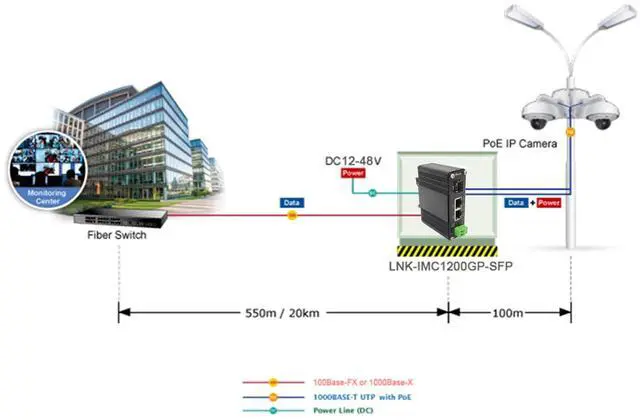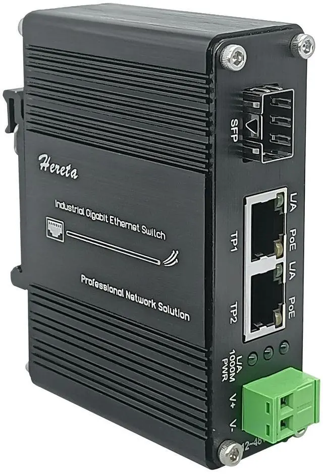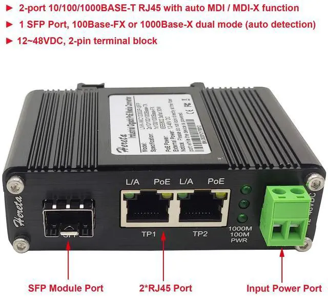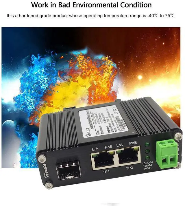 Compatibility Fiber Converter complies with IEEE 802.3 af PoE ( 15.4W ) and IEEE 802.3 at PoE+ (30W) ^^ Ports 1 RJ45 port 2-port 10/100/1000BASE-T RJ45 with auto MDI / MDI-X function 1 SFP Port 1 SFP Port, 100Base-FX or 1000Base-X dual mode (auto detection) SFP optical module support SM; MM; BiDi; DUAL ^^ Easy Installation Media Converter Supports DIN-Rail & Wall-mount installation ^^ Operating Conditions Environmentally hardened -40C to 75C (-40F to 167F) operating temperature;