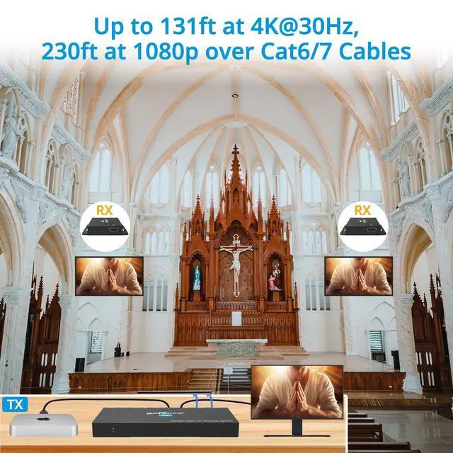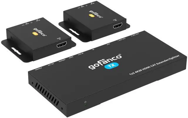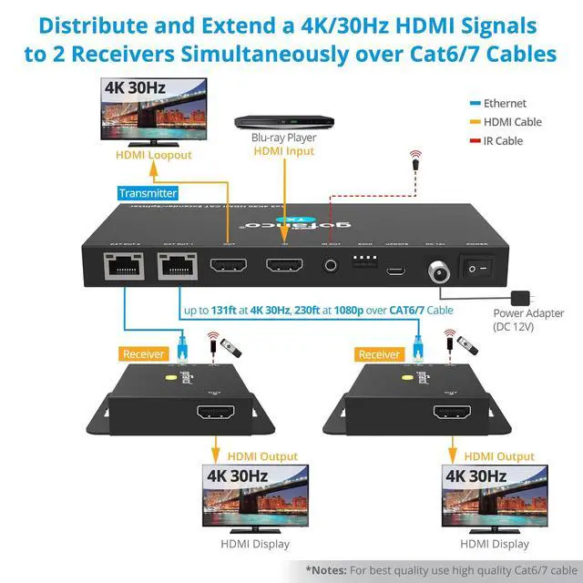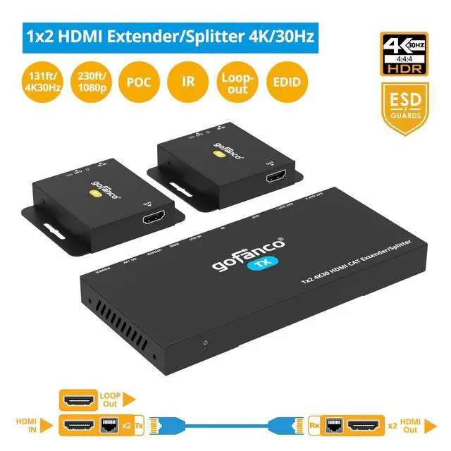 1x2 HDMI EXTENDER/ SPLITTER Extend and split one HDMI source to two CAT6/7 & one HDMI outputs simultaneously at near zero latency ^^ RESOLUTION & TRANSMISSION Supports up to 4K @30Hz, HDCP 1.4. Extends up to 131ft (40m) at 4K/30Hz, and 1080p at 230ft (70m) over CAT6/7 ^^ AUDIO FORMATS Supports PCM/LPCM/DTS-HD/DTS/Dolby Digital HDMI audio ^^ ADVANCED FEATURES HDMI loopout for a local display, One-Way IR Control, PoC. Supports Surge/Lightning/ESD Protection ^^ SIMPLE INSTALLATION No driver required; Surface-mountable metal housing. FCC, CE and RoHS compliant. Our products are backed with a 1-year limited warranty and experienced tech support team in Silicon Valley.