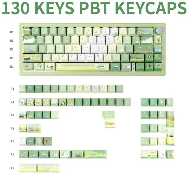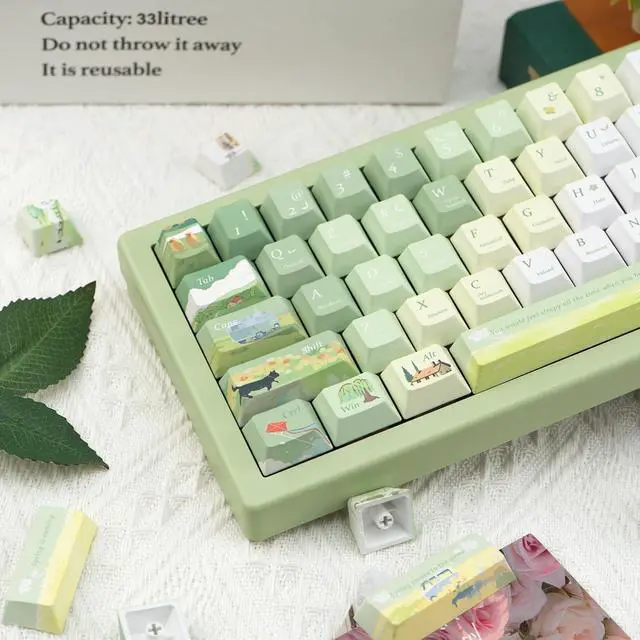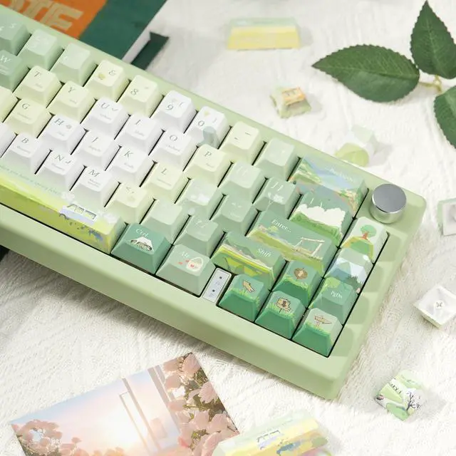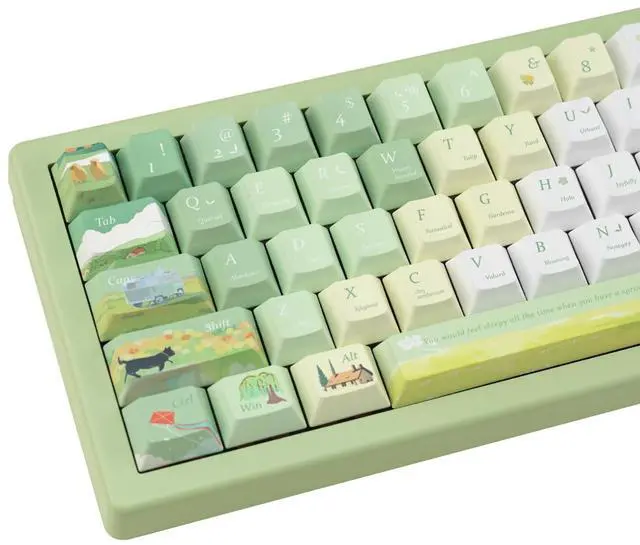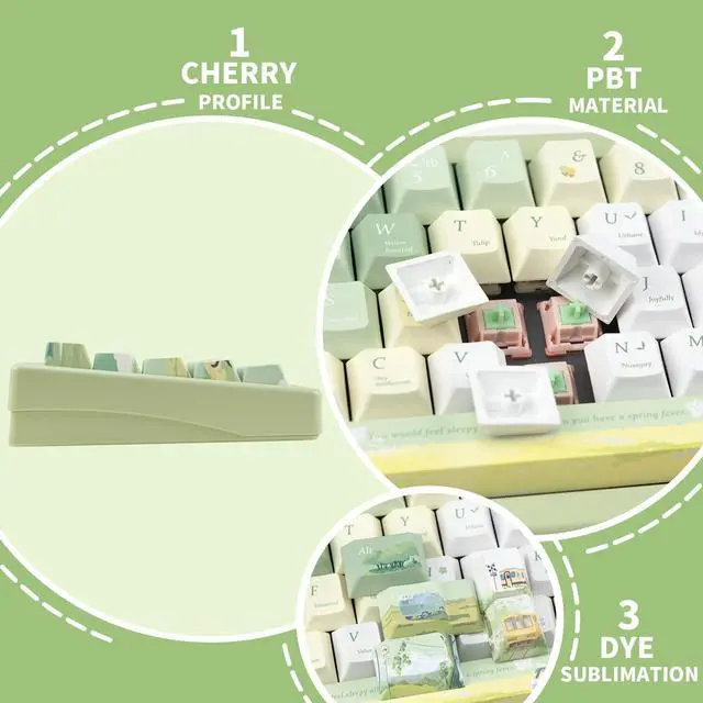 Cute Spring Theme Green KeycapsThis custom keycap is spring themed with gradient green, and then with a variety of spring landscapes, the strong spring atmosphere comes to the surface, which makes you feel like a spring breeze, and it's very fresh and cute. The vibrant scenery brightens your mood. ^^ Durable Dye Sub PBT Keycaps Made of textured, high-grade 5-sided dye-sub PBT for a more durable finish less prone to long-term, shiny grime buildup, these keycaps provide top-notch durability and comfortable experience of typing to you. ^^ Classic Cherry Profile KeycapsThe pbt keycap set designed with the classic Cherry profile, engineered for the ultimate typing experience.
