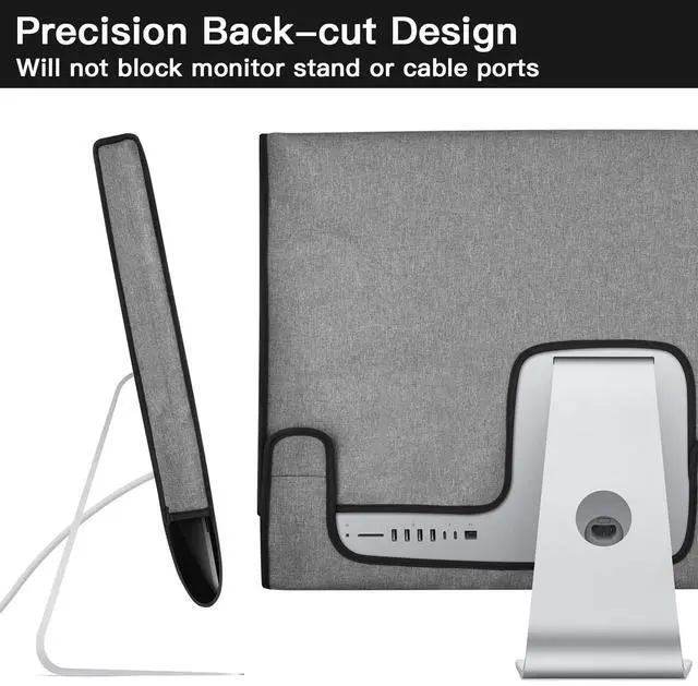 VERY IMPORTANTThis monitor dust cover is designed for Apple iMac 27-inch, compatible with 27-inch iMac A1312 / A1419 / A2115 and iMac Pro A1862. NOT for other displays. ^^ High Quality MaterialMade of premium 300D oxford cloth exterior and super soft lining interior, durable and washable. ^^ Good ProtectionProtects your iMac 27" against scratches, fingerprints, dirt, water, oils, scratches, sunlight and mildew ^^ Thoughtful DesignThe dust cover has a back cut that does not block the stand and wiring ports. Easy to put on and take off with the magic loop closure.