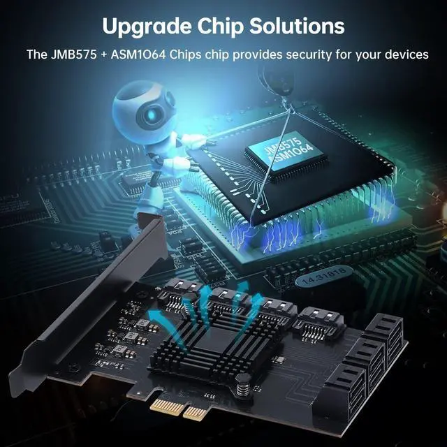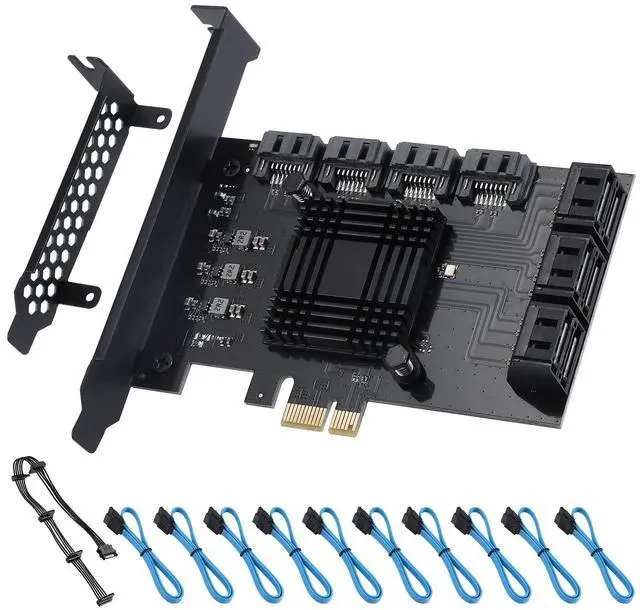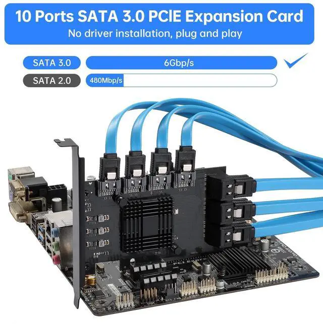 UNLOCK THE PERFORMANCE OF YOUR SSD WITH A PCIE SATA CARDACTIMED PCIe Express 3.0 to 10-Ports Adapter opens the possibility to connect Multiple HDD/SSD to your computer at peak performance. ^^ A SIMPLE CONNECTION Simply plug and play style setup. Install a hard drive to this component. RAID Support, Massive support of up to 160TB of storage. ^^ POWERFUL CHIPSET & ADVANCE HEATSINK Maximize your efficiency, stabilize your performance, and reduce error rate with ASM1064 & JB575 chip. Also, optimized cooling with aluminum heat transfer and maximize the effect of heat dissipation with a Heat-Sink.