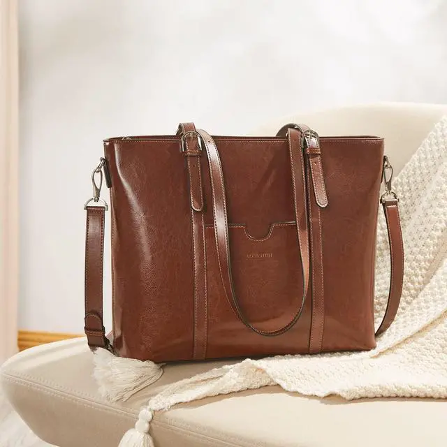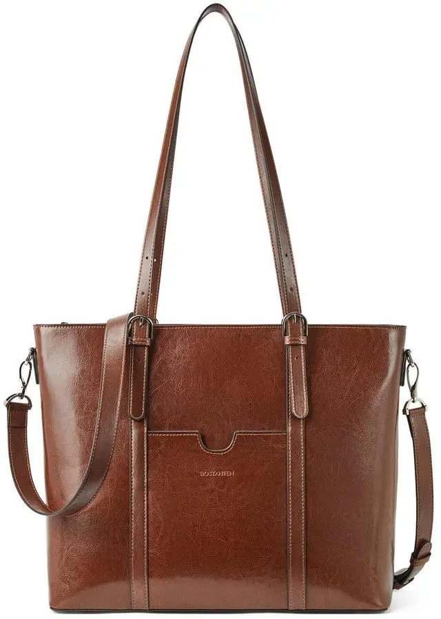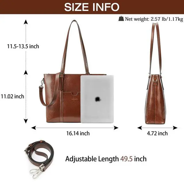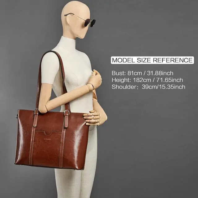 Material - Top oil wax leather imported from Italy, which is made of genuine cow leather. Durable and soft fabric lining, with silver Hardware. All these highlight the high quality and classic design of this briefcase. This is absolutely a much more excellent quality bag for daily use ^^ Dimensions - (L) 16.14" x (W) 4.72" x (H) 11.02" with an adjustable handle. The shoulder handle drop is 11.5 - 13.5. It also comes with a long shoulder strap ( 47.24 in length) for more carrying options: handheld, single shoulder, or crossbody. The weight is only 2.57 lb, fitting for your shoulder with less burden ^^ Structure - The main compartments including 1 laptop padded compartment, 2 slip pockets, 2 pen loops, and 1 inner zipper pocket. Padded compartment is secure for protecting your macbook or other 15.6 -inch laptops. Dedicated pockets and slots for your wallet, pens and smart phone. There are one front pocket for quick access and one back zipper pocket. Easily fit for your small things ^^ Feature - The leather laptop bag is made of top quality materials by professional craftsmen. Simple, stylish and classic in style, and with a large capacity, it is easy to carry a 15.6 inch laptop. This is absolutely a much more excellent quality bag for daily use ^^ Great Gift Idea - BOSTANTEN computer bag is the best gift for choice, and suitable for women of all ages and styles. It provides your friend or family member with a practical and stylish gift that shows your appreciation. It makes a great thoughtful gift idea for birthdays, anniversaries, Valentines Day, Mothers Day, Christmas, or any special event