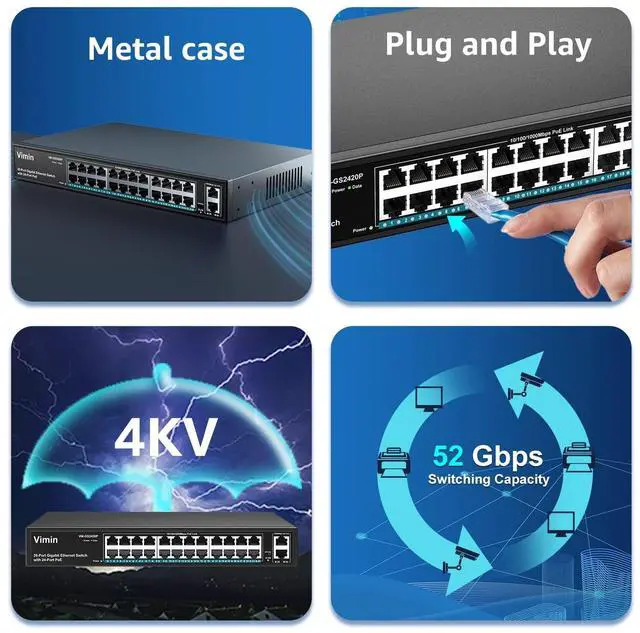 VIMIN 4 Port Gigabit PoE Switch with 1 Uplink Port & 24 Port Gigabit PoE Switch with 2X Gigabit Uplink Port , Support IEEE802.3af/at, One-Key VLAN, Plug and Play, Metal Case