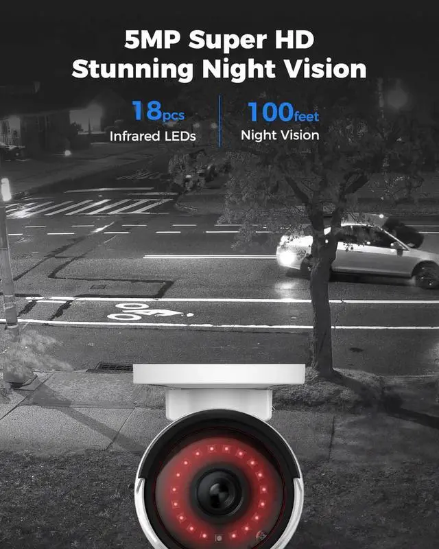 5MP SUPER HD & STUNNING NIGHT VISION Capture crystal clear videos day & night with 5MP super HD cameras. The 18pcs infrared LEDs allow you to get high-quality night vision up to 100ft, helping you to protect your property even at night. ^^ SMART PERSON/ANIMAL/VEHICLE DETECTION The new smart motion detection is now supported by this poe security camera system. Smart PoE IP cameras can identify people, animals, and vehicles, minimizing unwanted alerts triggered by bugs or leaves (please upgrade to the latest firmware version). Configure the type of motion you care about and get alerted when you really need to.