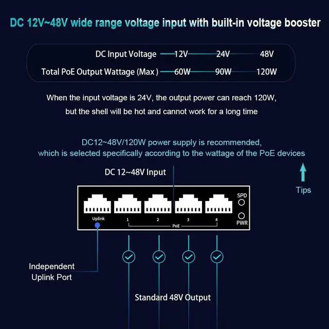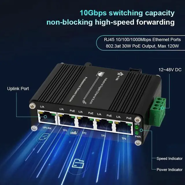 10/100/1000Mbps Ethernet The industrial 5 ports Ethernet PoE switch has 5 RJ45 ports 10/100/1000Mbps half/full duplex. 802.3 at 30w PoE output max 120w ^^ 3.74 x 2.76 x 1.18 in Ultra Small The 5 ports Ethernet PoE switch has smaller size than other switches, it only need small space to place it. Convenient and easy to install ^^ 12~48V DC Input The PoE switch support 12~48V DC redundant power input and boost to 48V output. It will solve the problem that you only have 12V or 24V centralized power supply or solar power supply. ^^ Industrial Grade Quality The hardened mini gigabit PoE switch use industrial grade components and aluminum housing, it can work at wide range temperature -40C to 75C (-40F to 167F).