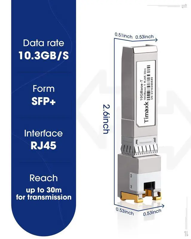 Reach: up to 30m for transmission ^^ Wide CompatibilityWidely Used in fiber switches, routers, NIC, server or other fiber optic equipments with 10Gb SFP ports. Compatible with Cisco, Ubiquiti, Mikrotik, D-Link, Netgear, Qnap, Linksys and others. ^^ Easy to usePlug and play, fully hot-pluggable. Easy installation. Rotate the ring latch down at 90 degree angle to unlock, then pulling transceiver out from switch. ^^ Durable raw materialsIt adopts the high quality of raw materials, to ensure strength and reliability for a long time, maintaining a stable connection in a wide range of environments. ^^ 100% UsableIn Timaxk Signal Integrity Lab, we 100% passed tested. Each transceiver is individually tested on switches before delivery.