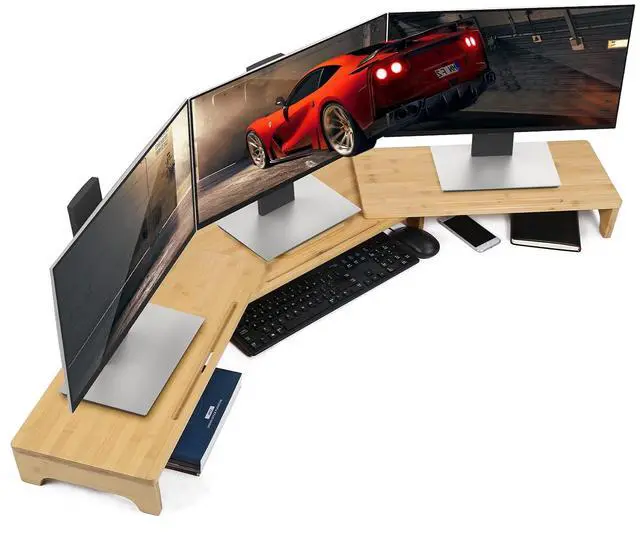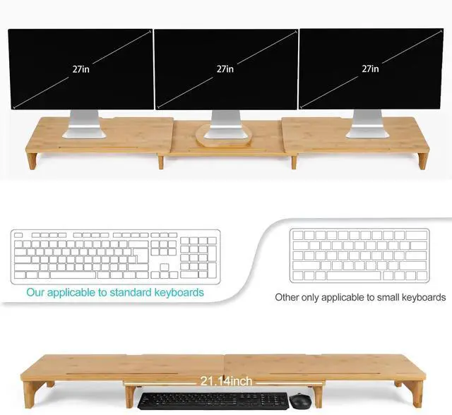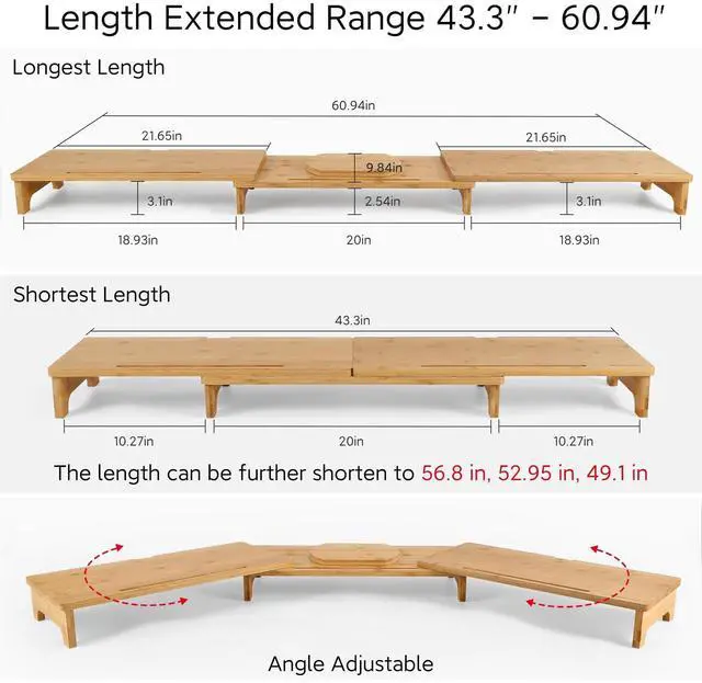 Triple Monitor Stand for DeskThe monitor stand is built up with 3 shelves, which can hold three 27" computer monitor(please refer to picture 3. Much space is available for matching multiple devices -PC/laptop/printer/books. You can also set up the desk as your need. ^^ Screen riser with Adjustable Length & AngleThree fix holes for adjusting the length. The minimum and maximum length of the monitor riser is about 43.3 in and 60.7 in. The angle of the left and the right shelf can be adjusted according to the desk corner construction and the size of computer screen.