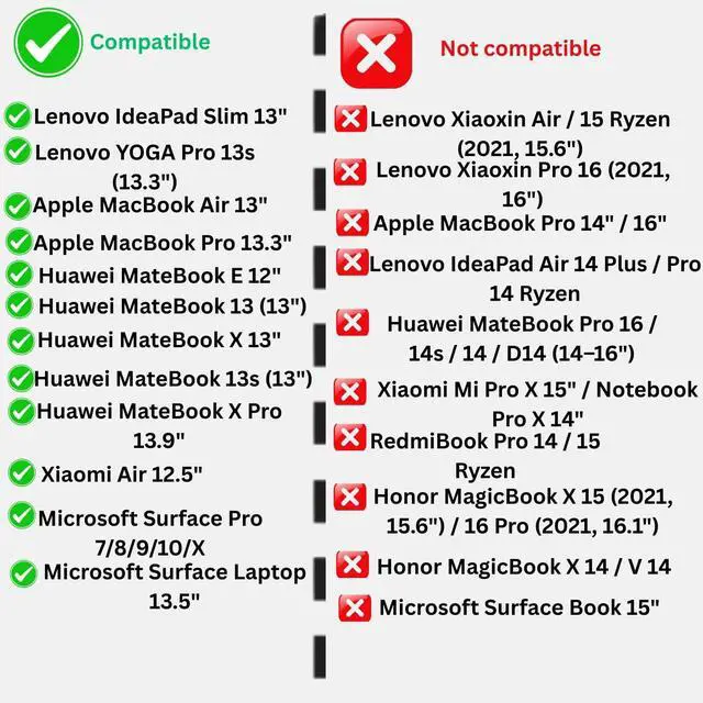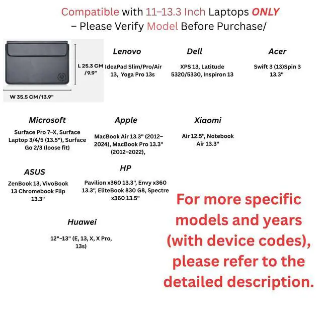 ^^ Compatible Devices: MacBook Air 13.3" (A1466, A1932, A2179, A2337), MacBook Air 13.6" (A2681, A3113), MacBook Pro 13.3" (A1502, A1708, A1989, A2251, A2338) MateBook E 12", 13"/13s, X, X Pro 13.9" Surface Pro 7/8/9/10/X ( 12.313" ), Laptop 13.5", Go 2/3 ( 10.5", loose fit) Xiaomi Air 12.5", Notebook Air 13.3" Lenovo IdeaPad Slim 13, YOGA Pro13s Dell XPS 13, Latitude 5320/5330 HP Pavilion x360 13.3", Envy x360 13.3", EliteBook 830 G8 13.3", Spectre x360 13.5" ASUS ZenBook 13 13.3", VivoBook 13 13.3", Chromebook Flip 13.3" Acer Swift 3 13.3", Spin 3 13.3" ^^ Precision fit for slim laptops up to 13.6 inches wide: Ideal for users seeking a compact sleeve that hugs their laptop securely without unnecessary space; perfect for protecting your device inside backpacks, messenger bags, or when carried solo for quick meetings or travels. ^^ Bonus matching accessory pouch included for ultimate convenience: Keep your charger, mouse, AirPods, cables, and portable hard drives organised and accessible with the included stylish accessory pouch, saving space and reducing clutter wherever you go. ^^ Professional, elegant appearance suitable for any environment: Designed with a sleek, minimalist style, this sleeve complements your professional wardrobe or casual look, making it the perfect companion for office workers, students, freelancers, and frequent travellers. ^^