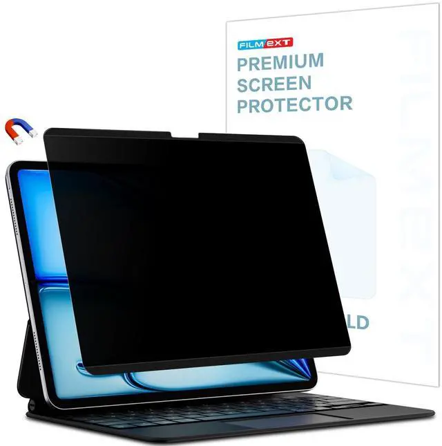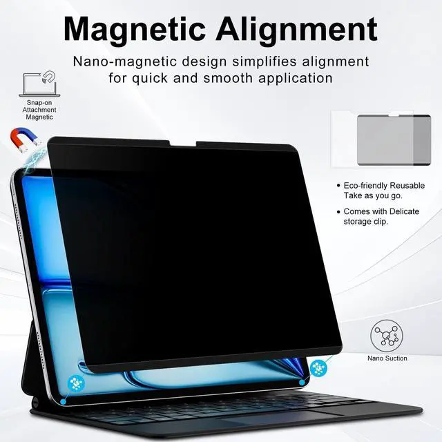 CompatibilityFILMEXT Magnetic ipad air privacy screen compatible with ipad air 11 Inch 2024/2025 (M2/M3, 6th/7th Generation) Model A3266 A3267 A3270 A2902 A2903 A2904. please check the model number on the back of the Ipad before purchase. ipad air 11 privacy screen protector compatible with Mic & Camera friendly. ^^ Advanced Magnetic Installation We have innovated the installation method of FILMEXT iPad privacy screen protector film guard, design with magnetic strip. Faster and easier to fix ipad private screen protector firmly on the screen. Installation or remove only takes one second. No adhesive, bubble free and reusable film, both sides can be washed.