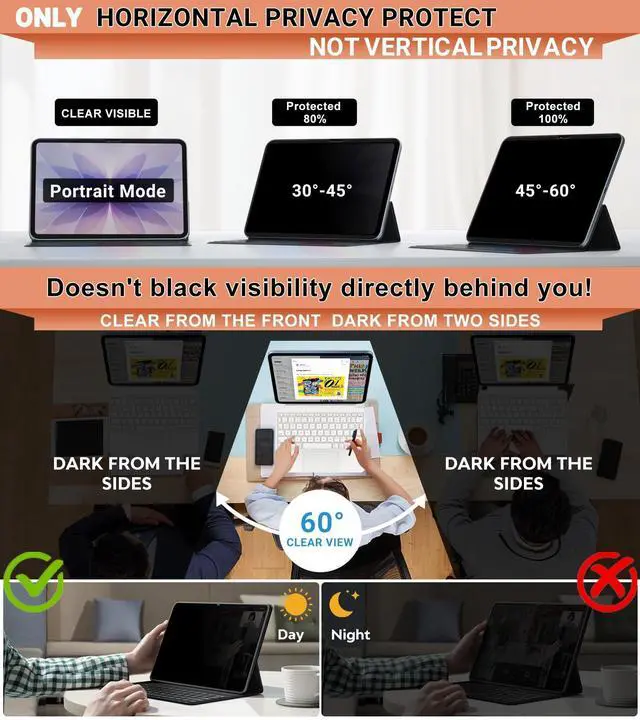^^ No More Worries from Prying EyesFILMEXT magnetic ipad 11 inch privacy screen Protector 2025, Landscape privacy angle is 30 degrees 5, transparency is 60%5, thickness is 0.35 mm. Data is only visible in front of the display, appears a darkened or black screen from side view, Perfect for corporate travel, open office settings, students, financial institutions, health care providers, government agencies. ^^ Eye Protection, Anti Glare, Blue Light Blocking FILMEXT ipad 11 inch privacy screen saver adopt anti-glare technology, protects your eyes by preventing strong light reflection, and built-in blue light blocking and UV filter layer process.