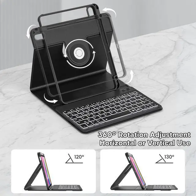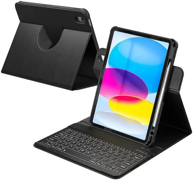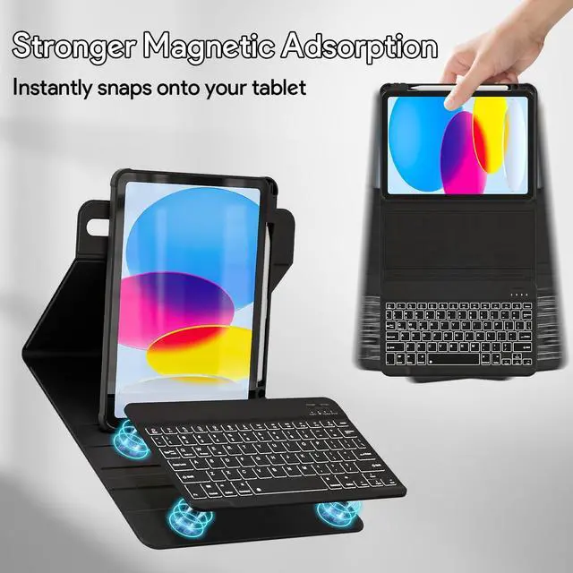 Generation 2022(Model Number: A2696/A2757/A2777/A3162). Please check the model number starting with "AXXXX" on the back of your iPad before purchasing. (This product does not include: Tablets & Pencils! ) ^^ 360 Rotatable Strong Magnetic AdsorptionThis protective case is made of premium PU leather and has 16 built-in powerful magnets, which can firmly absorb the keyboard to prevent the keyboard from moving and falling. The back cover can be rotated 360 degrees, The tablet can be placed horizontally or vertically, or it can be detached for use, allowing you to watch videos or read at a comfortable angle. ^^ 7 Colors Rainbow Backlight KeyboardThe RGB rainbow backlight keyboard for iPad 10th generation can provide you with a typing experience in the dark, and the backlight has 7 adjustable colors. These colors can be automatically switched in breathing light mode, and the brightness of the keyboard can be adjusted by pressing Fn+light key. When you don't need the backlight, you can turn it off. ^^ Long-Lasting Battery Life Rechargeable KeyboardThis keyboard has a built-in 420 mAh lithium battery, which charges for 2-3 hours and can work continuously for up to 60+ hours under normal use (without backlit ), which will automatically enter sleep mode when not used for a long time to save power, and click any key to instantly the wake-up.