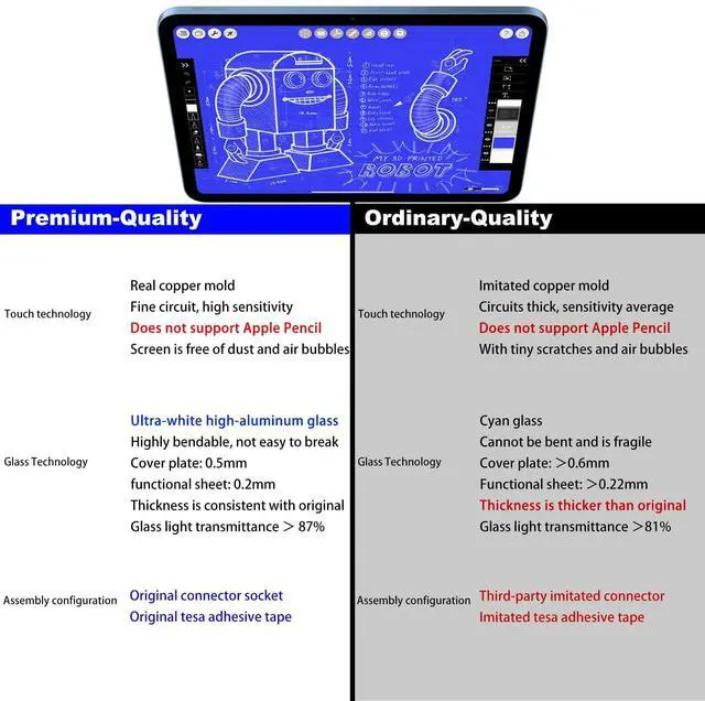 ^^ Premium Quality: This product is the screen closest to the original quality, period. Our iPad 7th/8th gen screen replacements touch responsiveness and glass hardness closely match original specifications. Craftsmanship details and key benefits of the iPad 7/8th gen 2019 2020 touch screen are detailed in the test video, A+ Content and main images.