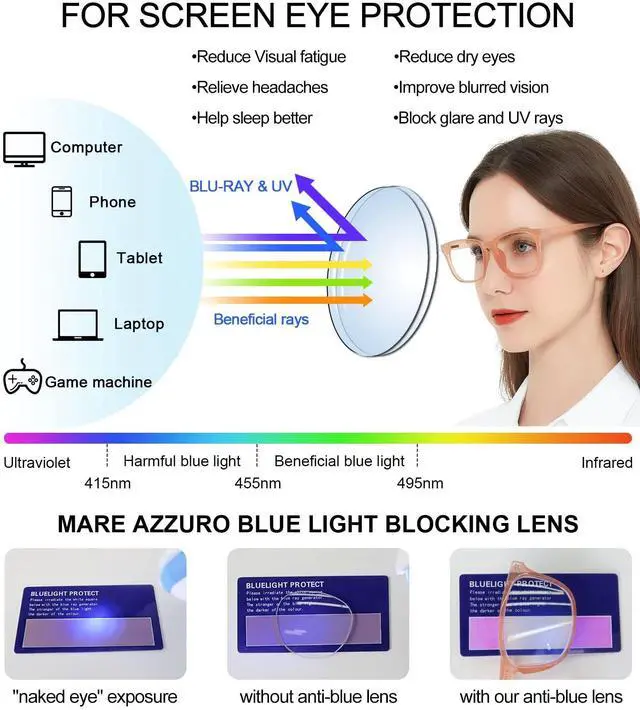 Blue light blocking reading glasses: A-class computer reading glasses 125 women can cut 100% of harmful blue light, glare and UV400. The Yellowish tinted lens can improve contrast, reduce chromatic aberrations, restore true colors. Relieving your eye strains and headache for reading, watching TV, gaming, using computer or mobile phone, to get a better sleep at night.