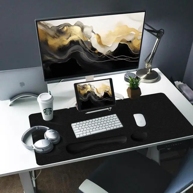 ^^ Anti-slip Base with Suede The artificial suede material used on the back of the desk pad has excellent anti-slip stability and softness, so you won't move easily when using the writing desk and can ensure the safety of all your desktop items. ^^ Waterproof & Easy to CleanThe PU leather material keyboard mat is waterproof and heat resistant, easy to clean. It can perfectly protect your desktop from drinks, ink and other liquids. For cleaning, just wipe its surface stains with a damp cloth. Please note that its suede backing is not waterproof! ^^ BEST CHOICEThe exquisite and durable desk mat provides a practical desktop organizer protector and decoration for your desk and home, and is the best choice for your own use or as a gift.