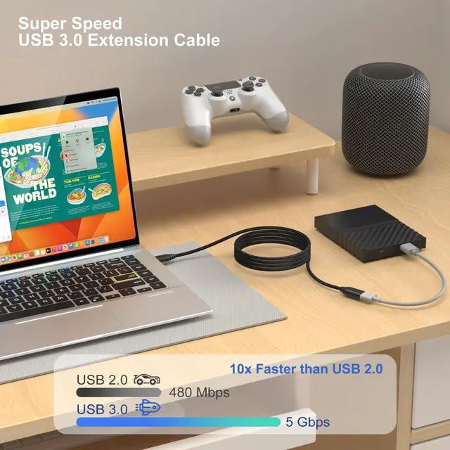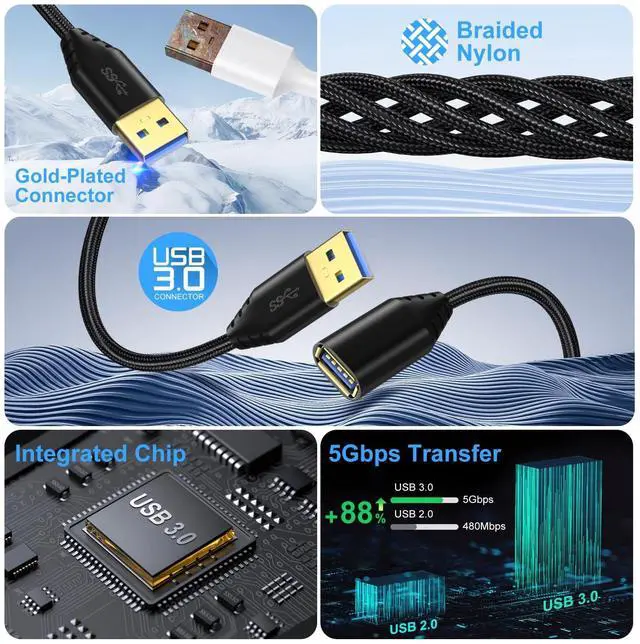 SUPER SPEED DATA TRANSFER: USB extension cable with high quality tinned copper inside maximizes signal quality and provides error-free data transmission. Enjoy faster USB 3.0 data transfer rate up to 5 Gbps, 10x faster than USB 2.0. (Backwards compatible with USB 2.0 devices) ^^ EXTRA LONG USB 3.0