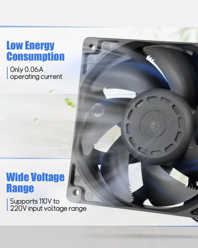 Product Parameters: Rated voltage: 110V-220V, Input current: 0.06A, Frequency 50/60HZ, Size: 12012038mm, Speed: 3200 10%RPM, Air volume: 122CFM