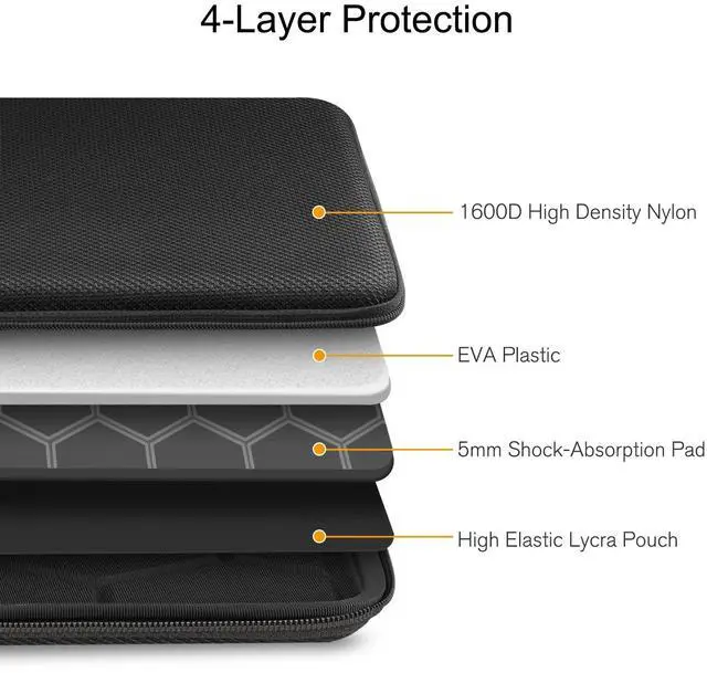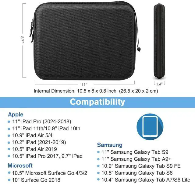 Wide CompatibilityInternal Dimension: 10.5 x 8 x 0.8 inches, compatible with 11-inch iPad Air M2 / iPad Pro M4 2024, iPad Pro M2/M1 (4th/3rd/2nd/1st Gen), 10.9 -inch iPad Air 5th/4th Gen 2022/2020, 10.9 -inch iPad 10th Generation 2022, 10.2 -inch iPad 9th/8th/7th Gen, 10.5 -inch iPad Air (3rd Gen) 2019, 10.5 -inch iPad Pro 2017, 9.7 -inch iPad 2018, iPad 1/2/3/4, iPad Air/Air 2, and other tablets between 9.7 -11 inches. ^^ Shockproof Tablet SleeveThis 9-11 inch tablet sleeve case consists of a semi-hard EVA shell with anti-scratching polyester to protect your devices from external shock, scratches, dust, and bumps. ^^ Superior Protective SleeveThis tablet sleeve equips with 5mm thick paddings, provides your computer/tablet with 360 all-around protection, premium & durable zippers for secure and long-lasting usage. ^^ Water-resistant Tablet BagThe outer fabric of the tablet carrying case is made from 1600D High-Density Polyester, which provides better water-repellency and wear-resistance than normal nylon. ^^ 9-11