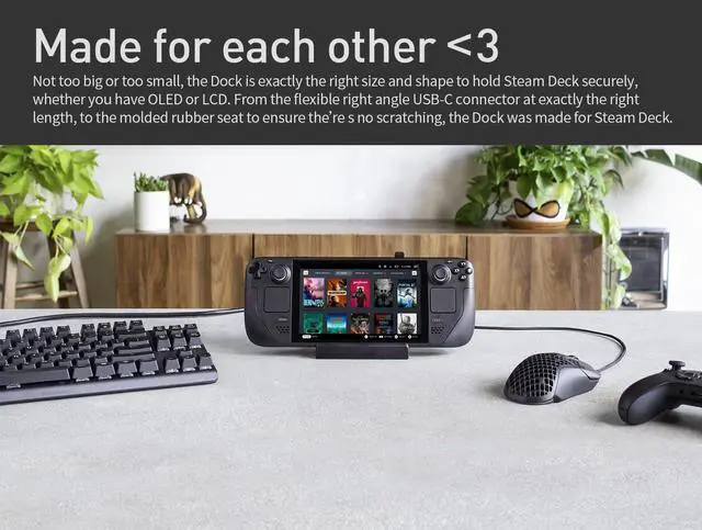Dock Deck to your TV and play games on the couch with your favorite wireless controllers. Set up a Dock at your work desk and get some keyboard / mouse work done on up to two external displays at a time. Or take it with you on the go in case you need to have more expandability wherever youre headed. ^^ Not too big or too small, docking Station is exactly the right size and shape to hold Steam Deck securely. From the right angle USB-C connector at exactly the right length, to the molded rubber seat to ensure there's no scratching, the dock was made for Steam Deck.