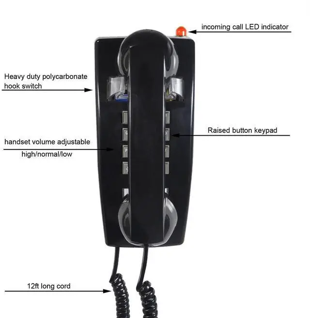 Functions IncludedRaised button keypad designed for repeated useMetal back panelTraditional bell ringerHandset volume controlHangs on a standard wall phone platePoly Carbonate Hook Switch for DurabilityWorks on any analog phone line (PSTN, VOIP) that is FSK or DTMF compatibleTelephone line poweredComes with wall plate for easy installation