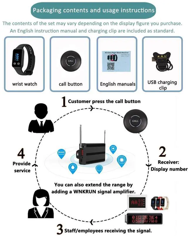 STRONG ANTI-INTERFERENCE: The pager watch can receive a calling signal from multiple call buttons at the same time, and the receiving range is up to 150m/500ft (depending on the practical usage environment). When the use distance is not enough, you can additionally match wnkrun's signal amplifier ^^