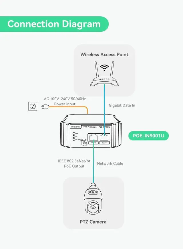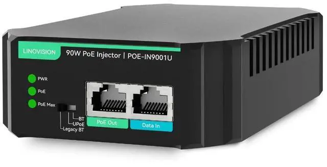 PoE Injector: Convert single ethernet port to IEEE 802.3 af/at/bt 90W PoE++ port, supply sufficient PoE power for IP camera, PTZ camera, PoE speaker, AP, etc. ^^ Excellent Compatibility with PoE and Legacy Non-Standard