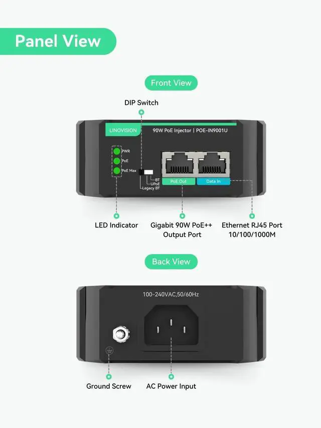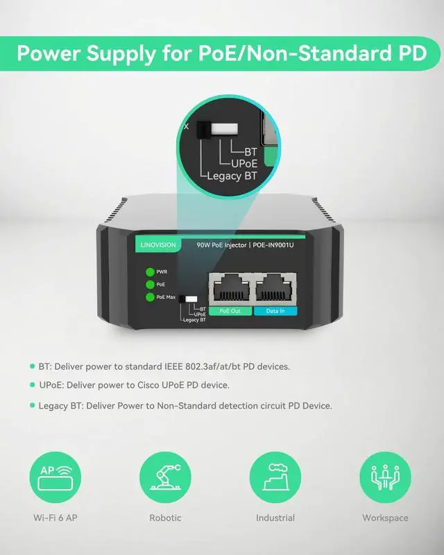 PoE Devices: Easily switch modes with a DIP switch to deliver reliable power to standard PoE, non-standard (Legacy), and Cisco devices (UPoE), ensuring compatibility for various power needs. It delivers standard IEEE 802.3 af/at/bt PoE output, ensuring safer and more efficient in energy use.