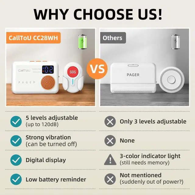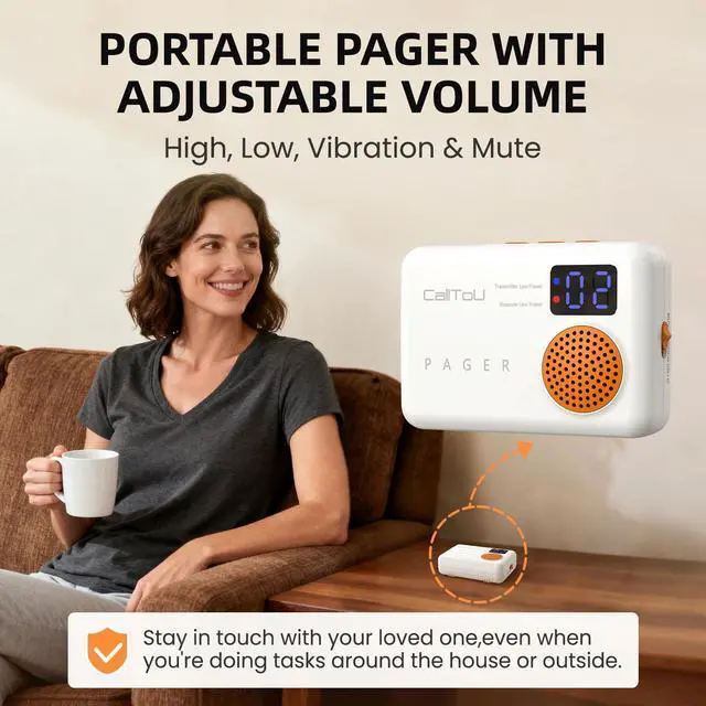 SMART & ADJUSTABLE ALERTS: The portable receiver doubles as a powerful call bell, featuring strong vibration and 5 adjustable volume levels (0-120dB) with two alert ringtones (Ding-Dong / Alarm). Youll always notice the call, whether in a quiet room or a busy environment. ^^ EASY TO CARRY & NO MONTHLY FEES: Designed for homes and small care units. With its belt clip and 500+ feet range, the receiver goes wherever the caregiver does. Enjoy complete freedom with no monthly fees. ^^ EXPANDABLE SYSTEM SUPPORTS 20