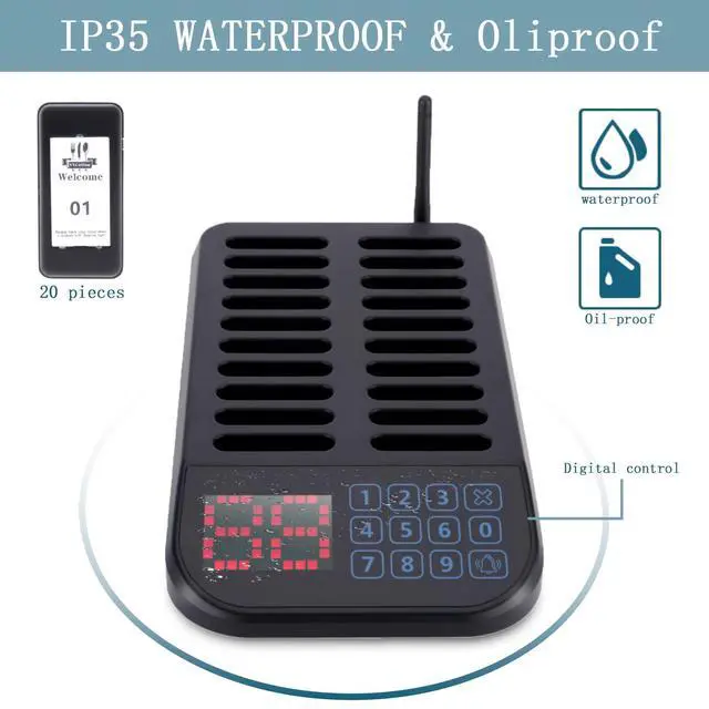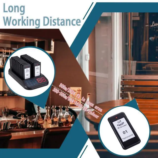 YYCALLING Wireless Calling SystemBased on 315MHZ radio-frequency, the indoor transmission distance is 984-1640 feet, and the open area can transmit up to 3280 feet/1000 meters, which can effectively reduce close contact and provide better safety protection measures for your employees, customers, and patients ^^ Calling Modes2 changebale modes for restaurant paging system are vibration + flash + buzzer and vibration + flash, meeting different occasions. ^^ Rechargeable Battery 20 charging slots provide power whenever you put the pager on the base, so you don't have to worry about running out of power.