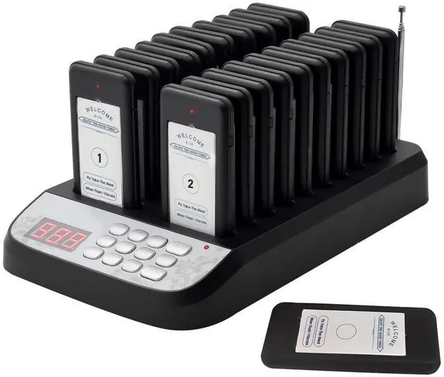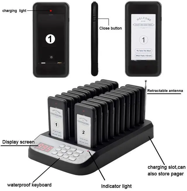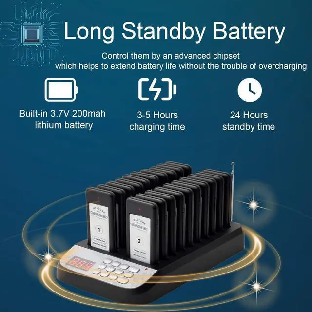 Outstanding Performance: Restaurant pagers system has 20 battery charging slots that can charge 20 receivers (IP55 waterproof) at the same time. Each receiver has a built-in 200mAh rechargeable lithium battery, Approximate standby time of up to a full day ^^