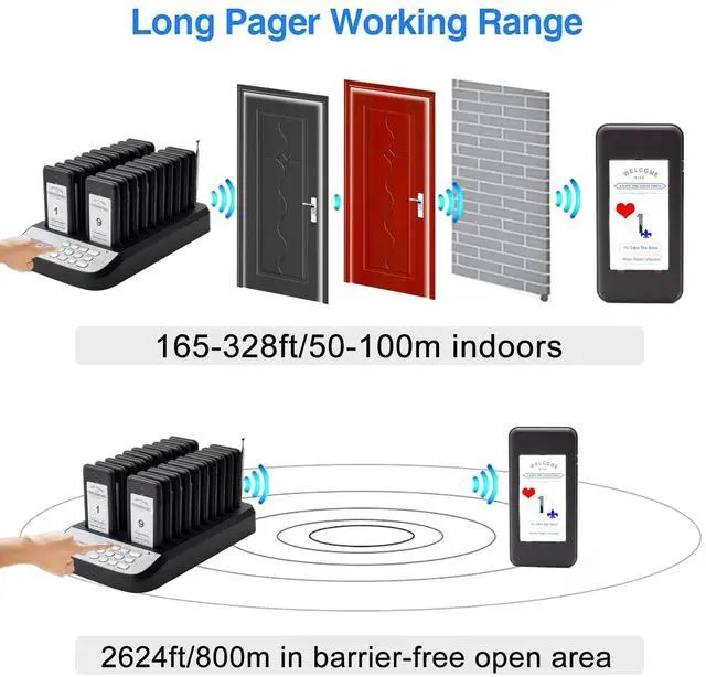 Range Pager System: Indoor distance up to 165-328ft/50-100m, The longest distance in the barrier-free environment is 2624ft/800m in open area, it can effectively reduce the crowd gathering and provide better safety protection measures for your staffs and customers ^^