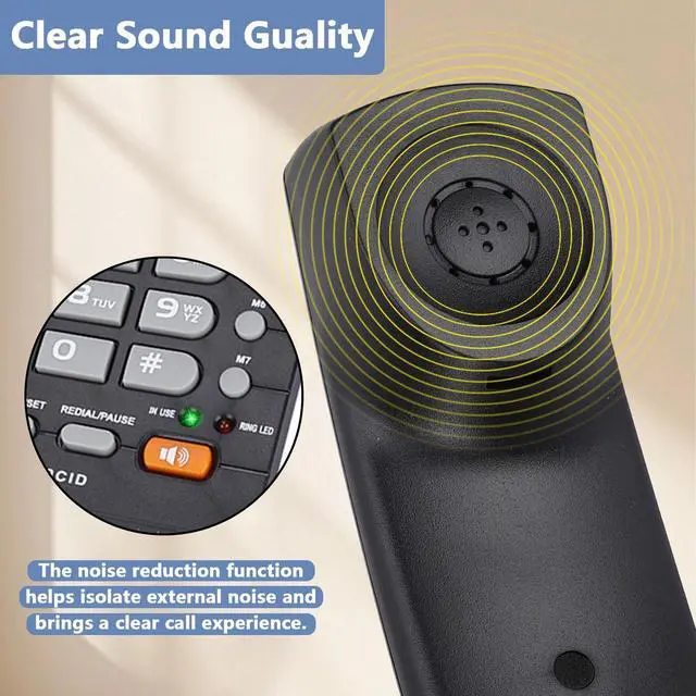 [Lcd Display] Real-time date, call time record, and incoming call number displayed on the lcd screen. ^^ [ Material] Made of abs, providing durability for long-term use. ^^ [Large Buttons] User-friendly design with large buttons for easy visibility of numbers and letters. ^^ [Clear Sound] Noise cancelling function ensures clear communications by minimizing external noises. ^^ [Extension Set] Dual port design for easy extension; supports extension set.