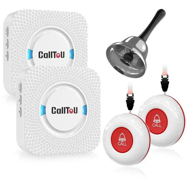 [ Wireless Guard ] 2 Receivers 2 Call Buttons and 1 Hand Call Bell. Allow caregivers and residents to be free while ensuring that help is still available at the touch of a button or shaking a bell, ideal for elderly, seniors, patients, disabled ^^ [ Easy to Carry ] The receiver can be moved with the caregiver and the open area working range is 500+ ft, you can take it to the bedroom, kitchen or living area (receiver requires plugging into an outlet). The call button can also be hung around the neck of the person with a neck strap who needs help like a pendant or secured with a bracket or double sticker ^^ [ Smart Ringtones ] The receiver of caregiver pager has 55 ringing tones to choose from and 5 level adjustable volume from 0db to 110db.