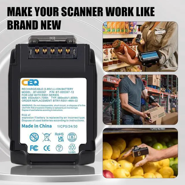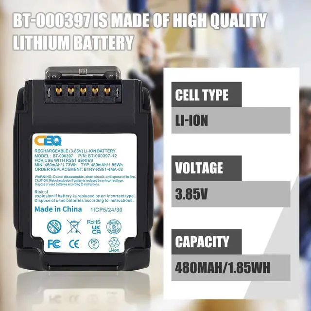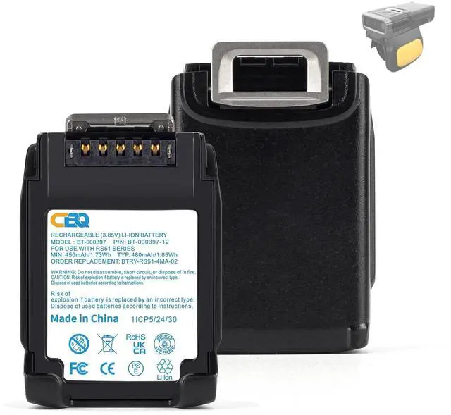 Battery specification: 480mAh/ 1.85W h/ 3.85V, Size: 1.65 x 1.18 x 0.55I n. ^^ RS61 2D Bluetooth Scanner BatteryThe battery has a built-in, microchip that prevents overcharging and discharging, short circuiting, overheating, etc. it protects the battery and protects you. ^^ BTRY-RS51-4MA01 Battery ReplacementThe battery is made of high quality lithium battery, safe packaging, built-in high quality chip, to give you the best and safest experience. ^^ BT-000397 Scanner Battery If the battery has any quality or other problems on the way, please contact us by email and we will provide the perfect solution for you.