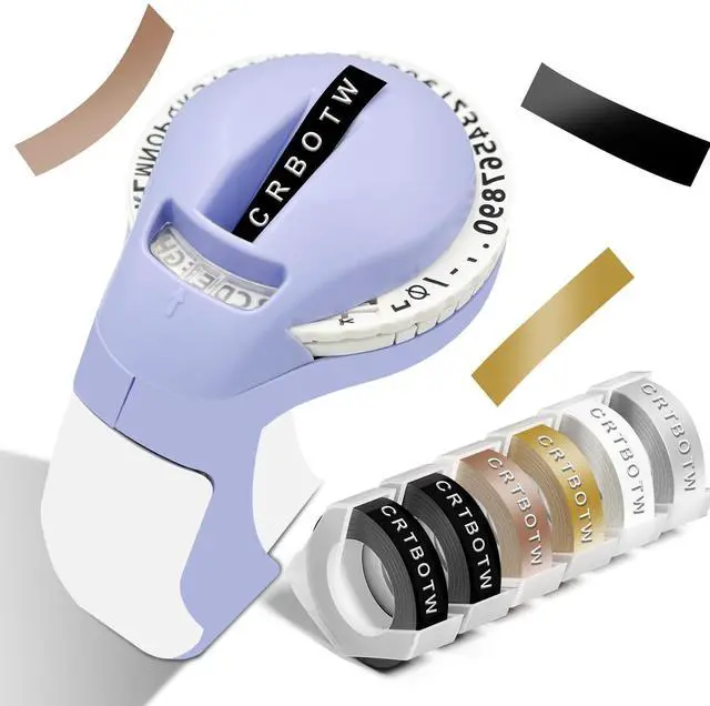 ^^ Product includes: One purple embossed label maker and 6 embossed label tape.