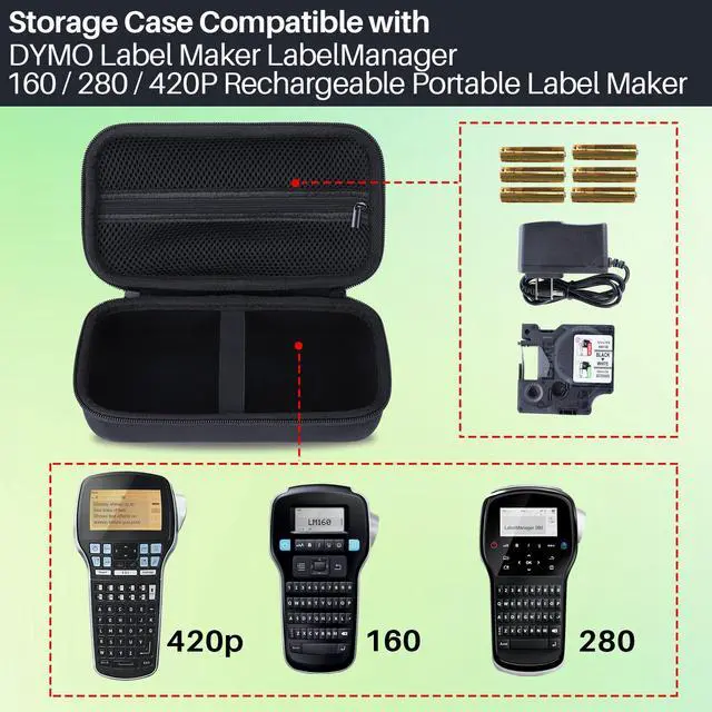 Portability for the case: The case compatible with DYMO LabelManager 160 or DYMO LabelManager 280 or DYMO LabelManager 420P label maker is equipped with a convenient carry on strap, which is compact and easy to carry to schools, parks, or anywhere outside. It can also be placed in a backpack, car seat, or handbag when going out. Notice!! Only LabelManager 160 Case! (DYMO LabelManager 160 or DYMO LabelManager 280 or DYMO LabelManager 420P label maker and its accessories are not included)
