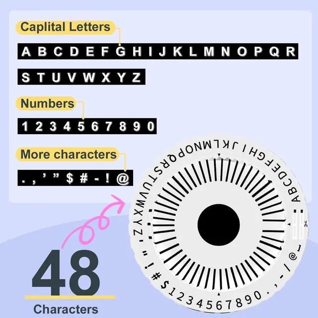 Starter Kit with 48 Characters : embossing label maker features a sturdy 48-character POM wheel with A-Z, 0-9, and common symbols for all your labeling needs.