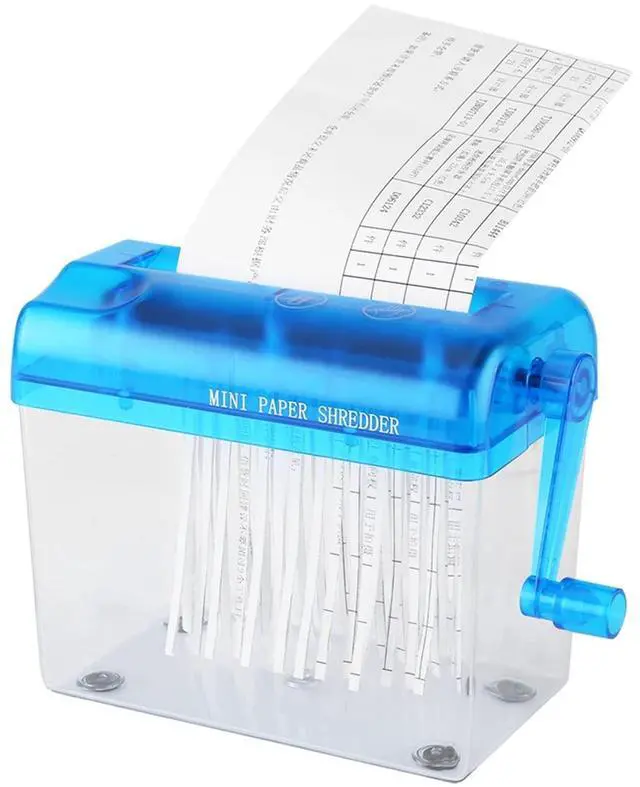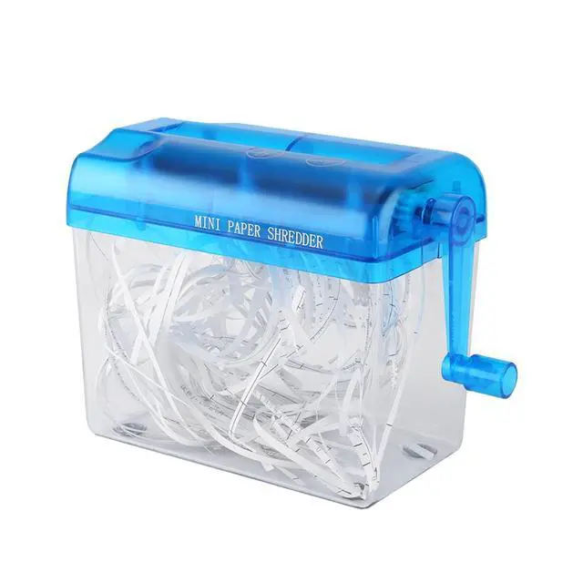 TO STORE: The hand crank can be easily detached when not in use, making this mini paper shredder highly portable and convenient for storage. Its lightweight design and small footprint ensure it fits seamlessly into any space or home environmentVERSATILE: Available in multiple colors including blue, pink, and grey, this mini manual shredder combines functionality with aesthetic appeal. Its simple usage and stable ABS construction make it a great choice for everyday use in various settingsSpecifications: Product