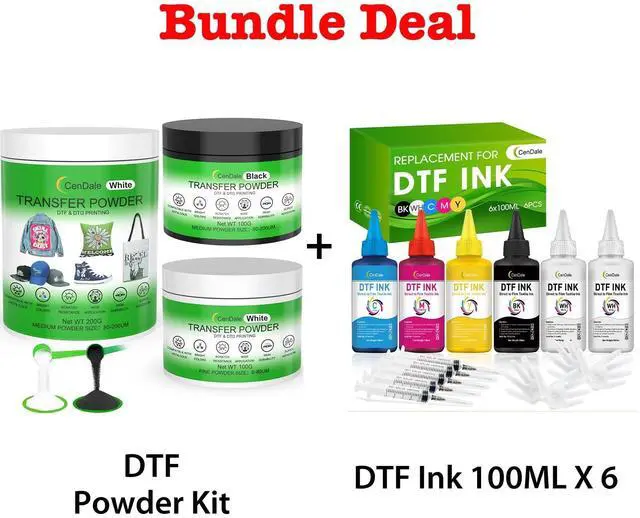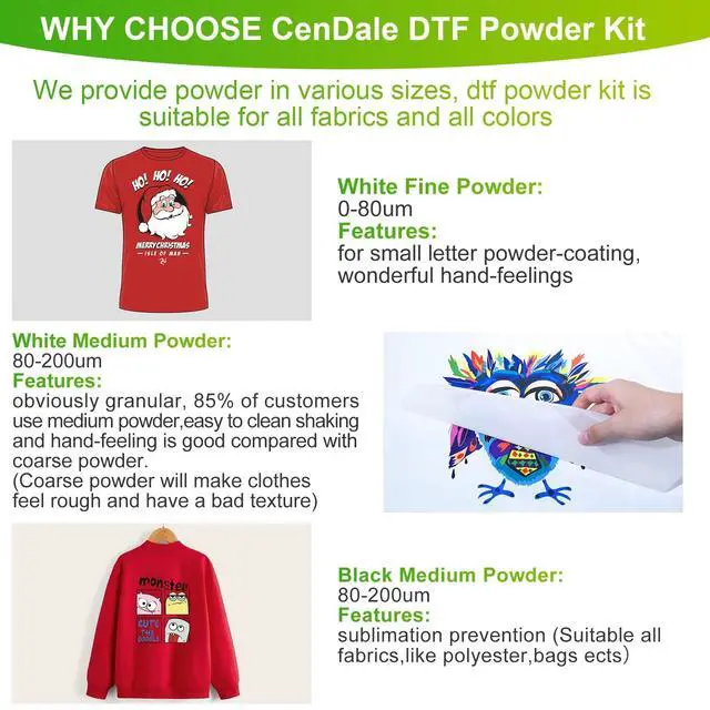 UPGRADED FORMULACenDale DTF ink adopts German Solvent and Japanese Resin and Color Paste. High ink fluency and Great Color Fastnessthe. The printed patterns are more soft and durable. Premium quality with high coverage for all DTF Films. Wide gamut, high color density and saturation. Washable and not easy to fade. ^^ DTF POWDER KITCenDale dtf transfer powder include White Fine Powder (100g), White Medium Powder (200g), Black Medium Powder (100g). DTF powder can be printed on non-treated cotton, Jeans, silk, polyester and many other material. ^^ Widely Application DTF Transfer PowderDTF powder kit is suitable for all fabrics and all colors.