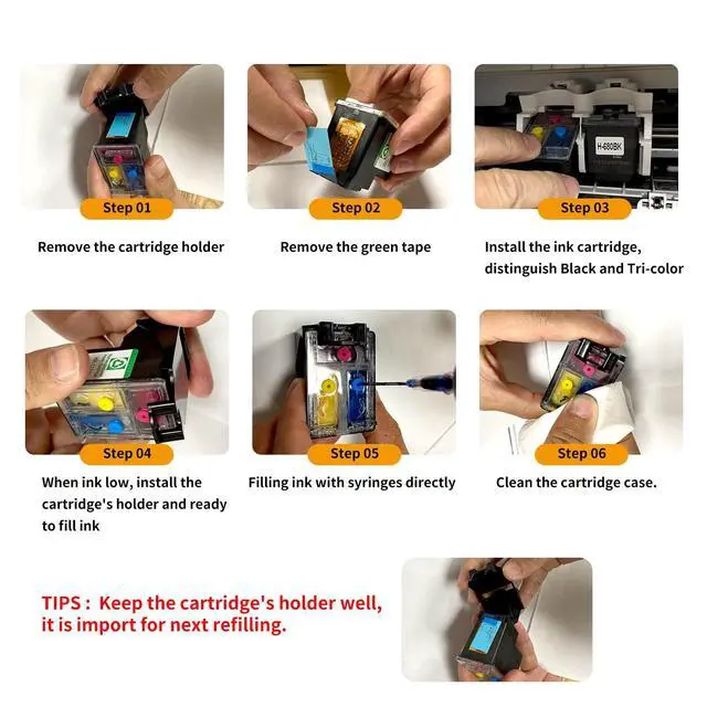 Ink Bottles: Black x 200ml (2 bottles), Cyan x 100ml, Magenta x 100ml, Yellow x 100ml ^^ 2) The Ink Cartridges are Refillable ones, Can be refilled again and again. It comes with Transparent cover, there are holes for refilling, VERY EASY FOR REFLIING. Replacement for Hp 63 Ink Cartridges, 63XL Ink Cartridges, Remanufactured 62XL Ink Cartridges ^^ 3) Compatible with
