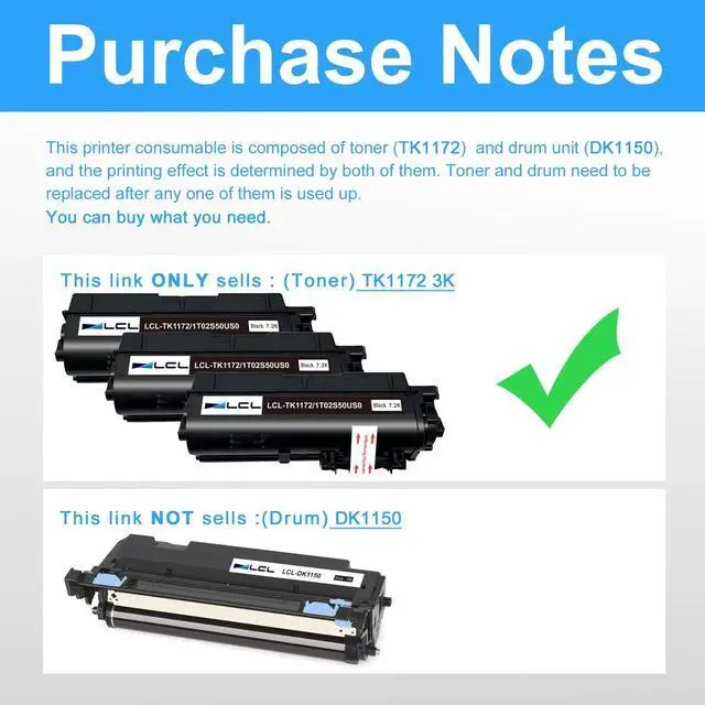 Reliable Quality: LCL TK1172 cartridge uses high quality toner, toner particle size distribution, good mobility, high transfer rate, resulting in a clear image and high gloss print effect; Printing efficiency is high, waste powder rate is low, so as to ensure sufficient page yield.