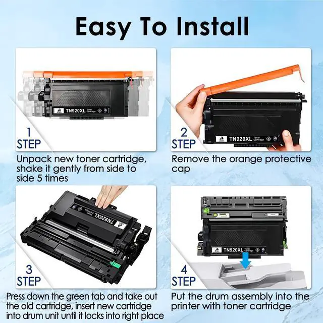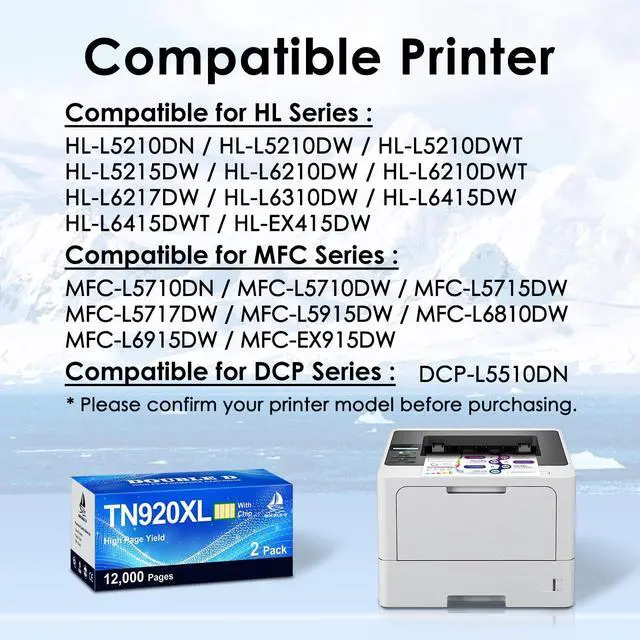 Compatible Printers HL-L5210DN, HL-L5210DW, HL-L5210DWT, HL-L5215DW, HL-L6210DW, HL-L6210DWT, HL-L6217DW, HL-L6310DW, HL-L6415DW, HL-L6415DWT, HL-EX415DW, DCP-L5510DN, MFC-L5710DN, MFC-L5710DW, MFC-L5715DW, MFC-L5717DW, MFC-L5915DW, MFC-L6810DW, MFC-L6915DW, MFC-EX915DW Printers. ^^ Packag Contents 2 x TN920XL toner cartridges, 1 x User Guide. ^^ Advantages Multiple Certifications, Premium Print Quality, Cost Effective, Newest Chip, Secure PackedShow Ink Level. ^^ High Page Yield6000 pages per TN920XL toner cartridge at 5% coverage. ^^ Product Quality Control Certified by ISO9001and MSDS. Strictly tested with industry quality control processes for compatibility, performance, print quality and page yield.