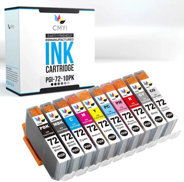 Package Contents: 1x CMYi PGI-72 Matte Black, 1x PGI-72 Photo Black, 1x PGI-72 Cyan, 1x PGI-72 Magenta, 1x PGI-72 Yellow, 1x PGI-72 Photo Cyan, 1x PGI-72 Photo Magenta, 1x PGI-72 Gray, 1x PGI-72 Red, 1x PGI-72 Chroma Optimizer ink cartridges (This is not an OEM product)